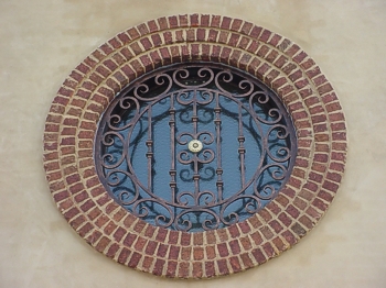 這款TYC-007型號窗是無錫鐵藝護欄廠為別墅定制的。采用的是少見的圓形窗,此窗模仿了時鐘的樣式,彎花,線條都很精致。中間的金屬鑲嵌,將時鐘的樣子展示到淋漓盡致,提醒人們珍惜光陰。時鐘的造型復古又典雅,融合了歐洲時尚元素,將藝術氣息發揮的淋漓盡致,濃厚的歐美范兒